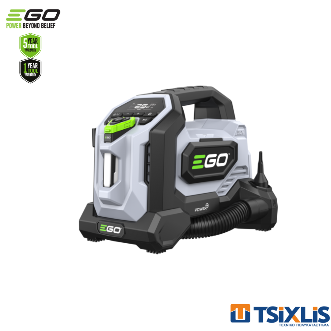 Να είστε έτοιμοι για κάθε εργασία φουσκώματος με το EGO Compact 3-σε 1 αεροσυμπιεστή. Εναλλάξτε μεταξύ λειτουργίας υψηλής πίεσης και υψηλού όγκου για να αντιμετωπίσετε γρήγορα και με ακρίβεια από ελαστικά έως στρώματα αέρα. Τροφοδοτούμενο από την μπαταρία EGO 56V ARC Lithium™, προσφέρει γρήγορη και αξιόπιστη απόδοση όπου κι αν τη χρειάζεστε. Ο αποσπώμενος φακός σας επιτρέπει να εργάζεστε με σιγουριά σε χαμηλό φωτισμό, ενώ η ενσωματωμένη αποθήκευση για σωλήνες και αξεσουάρ κρατά τον εξοπλισμό σας συμπαγή, οργανωμένο και έτοιμο για χρήση. Προσφέρει πολλαπλές λειτουργίες, όπως υψηλή πίεση έως 160 PSI, λειτουργία υψηλής έντασης για το γέμισμα φουσκωτών στρωμάτων και πισίνων και λειτουργία ξεφουσκώματος. Ορίστε και αποθηκεύστε έως και τέσσερις ρυθμίσεις PSI με λειτουργίες μνήμης, ώστε να μην χρειάζεται να ανατρέχετε στο εγχειρίδιό σας κατά το γέμισμα ελαστικών. Αφαιρούμενο μαγνητικό φως δραστηριότητας με αναδιπλούμενο γάντζο που προσφέρει έως και 300 lumen και έλεγχο θερμοκρασίας χρώματος σε τρεις ρυθμίσεις: 3000K, 4000K και 5500K. Συμπαγές και ελαφρύ με ενσωματωμένη λαβή για εύκολη μεταφορά.