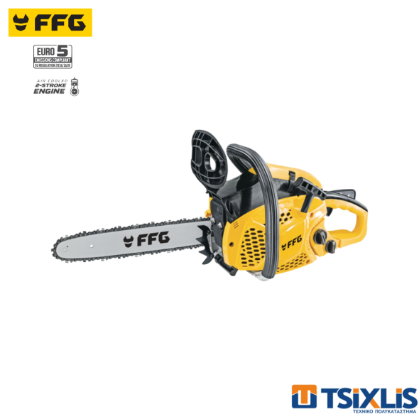Αλυσοπρίονο βενζίνης από την F.F.G με WALBRO καρμπυρατέρ και φίλτρο καυσίμου. NGK μπουζί. Αερόψυκτος δίχρονος κινητήρας. Eύκολη εκκίνηση και διακόπτης αυτόματης επαναφοράς. Διαιρούμενος στροφαλοθάλαμος.