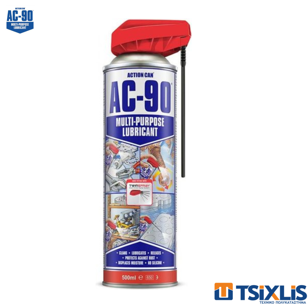 Το AC-90 είναι βιομηχανικό λιπαντικό πολλαπλών χρήσεων σε σπρέι και δεν περιέχει σιλικόνη ή CFC. Το AC-90 θα διεισδύσει και θα απελευθερώσει σκουριασμένα ή μπλοκαρισμένα εξαρτήματα. Εκτοπίζει την υγρασία από τα συστήματα ανάφλεξης των κινητήρων και βοηθά στην εκκίνηση και την ομαλή λειτουργία. Απλά ψεκάστε με το λιπαντικό πάνω από το εξωτερικό όλων των αγωγών, των απαγωγών μπουζί και όλων των ηλεκτρικών εξαρτημάτων για να αποφύγετε ελαττώματα που προκαλούνται από την υγρασία. Το AC-90 λιπαίνει, καθαρίζει και αποκαθιστά την ομαλή και αθόρυβη λειτουργία των μεντεσέδων, των κλειδαριών, των δρομέων συρταριών και των γραμμών κουρτίνας. Καθαρίζει όλα τα μέταλλα και αφαιρεί την διάβρωση από επιφάνειες εμαγιέ όπως ψυγεία, κουζίνες και νεροχύτες από ανοξείδωτο χάλυβα, αφήνοντας μια προστατευτική μεμβράνη κατά της σκουριάς. Είναι ιδανικό για την προστασία μεταλλικών εξαρτημάτων κατά την αποθήκευση ή την κατασκευή, όπως βρύσες και ντους. Το λιπαντικό AC-90 δεν εκτελεί ηλεκτρική ενέργεια εντός της κανονικής εμβέλειας που βρίσκεται στο σπίτι ή στη βιομηχανία. Είναι το ιδανικό λιπαντικό σκεύασμα καθαρισμού πολλαπλών χρήσεων για το σπίτι, το συνεργείο, το γκαράζ και το εργοστάσιο.