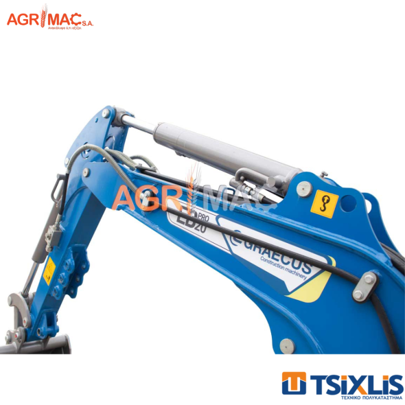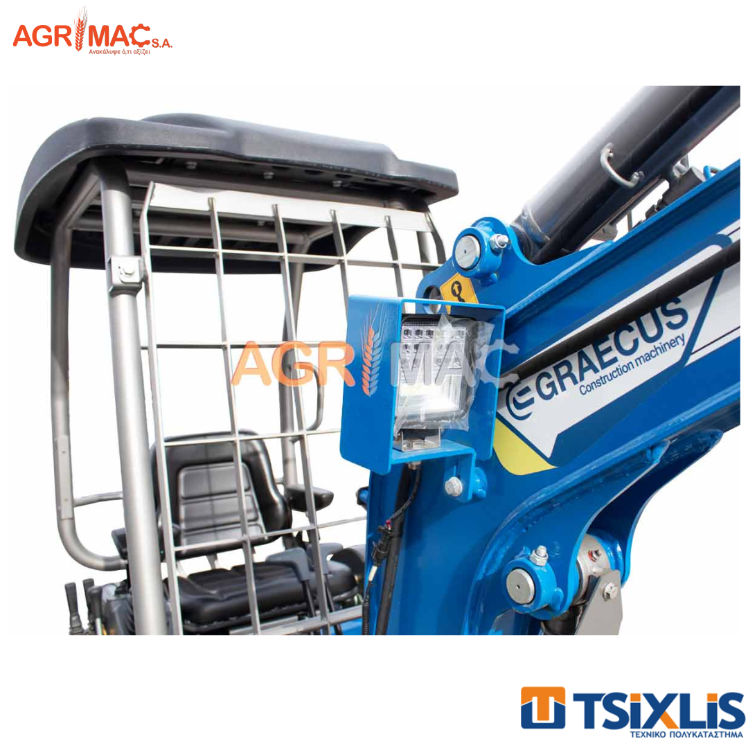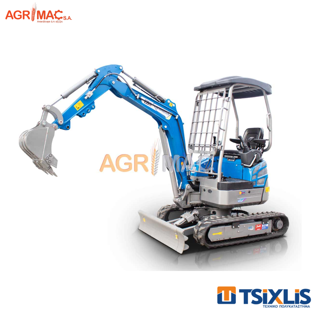 Εκσκαφέας ερπυστριοφόρος Agrimac 2T Graecus EB20-PRO. Με δυνατότητα περιστροφής μπούμας, που βελτιώνει τη χρήση σε μικρά μέρη και κατά μήκος του τοίχου. Υδραυλικά πτυσσόμενες ελαστικές ερπύστριες 99 – 125cm. Το πλάτος της λεπίδας ισοπέδωσης μπορεί να προσαρμοστεί εύκολα και γρήγορα με έναν πείρο ώστε να ταιριάζει με το πλάτος των πτυσσόμενων ερπυστριών. Οι πλαϊνοί μοχλοί ελέγχου βελτιώνουν την ταχύτητα και μειώνουν την κόπωση κατά την εργασία. Τρικύλινδρος πετρελαιοκινητήρας KUBOTA D902 16hp – 2300r/min, νέας γενιάς STAGE V με χαμηλότερη κατανάλωση. Ισχυρή υδραυλική αντλία CASAPPA ITALY. Ανεξάρτητοι υδραυλικοί κινητήρες πορείας με υδραυλικό κλείδωμα. Ανθεκτικός κινητήρας NACHI JAPAN περιστροφής ανωδομής 360° με υδραυλικό κλείδωμα. Ψυγείο υδραυλικού λαδιού για την βέλτιστη χρήση υδραυλικών παρελκομένων. Υψηλών προδιαγραφών υδραυλικό σύστημα βαλβιδών και χειριστηρίων WALVOIL ITALY. Γραμμή υδραυλικής παροχής στη μπούμα για μελλοντική σύνδεση σφύρας ή άλλων παρελκόμενων (γραμμή διπλής ενεργείας). Μπούμα με εγκατεστημένους υδραυλικούς σωλήνες στο κέντρο του πάνω μέρος της, προς αποφυγή ζημιών. Μοχλός ασφαλείας για το κλείδωμα των βασικών λειτουργιών του μηχανήματος. Προστατευτική μπάρα με σκέπαστρο και 360° ορατότητα. Χυτό αντίβαρο στο πίσω μέρος, βελτιώνει σημαντικά τη σταθερότητα του εκσκαφέα. Πίσω ανοιγόμενο καπάκι για εύκολη πρόσβαση κατά την συντήρηση. Στον στάνταρτ εξοπλισμό περιλαμβάνεται ηλεκτρική εκκίνηση με μίζα 12V και ωρόμετρο. Δυνατότητα προσαρμογής όλων των δομικών αξεσουάρ και μηχανημάτων. Εύκολο στην χρήση με διεθνή πρότυπου χειριστήρια ISO. Προβολέας εργασίας LED στην μπούμα. Δύναμη εκσκαφής στον κουβά 1400kg. Περιλαμβάνει κουβά εκσκαφής 400mm. Διαπερνά από πόρτα( 99εκ). Δεξαμενή καυσίμου 19L. Με Ευρωπαϊκό πιστοποιητικό ασφαλείας CE.