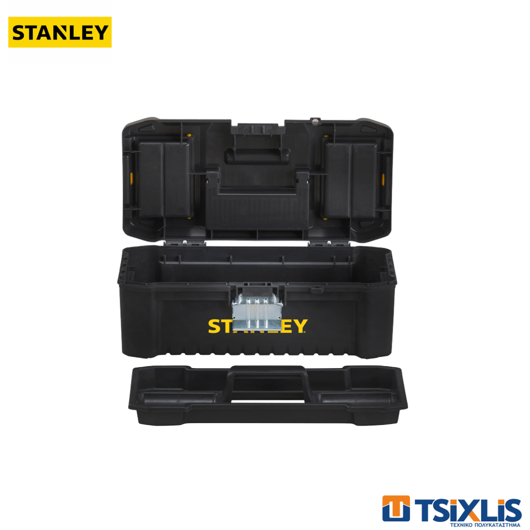 Εργαλειοθήκη Stanley, κατασκευασμένη από πολυπροπυλένιο. Με δύο μικρές ταμπακιέρες στο καπάκι. Αφαιρούμενο δίσκο. Μεταλλικά κουμπώματα για εύκολο άνοιγμα και κλείσιμο.