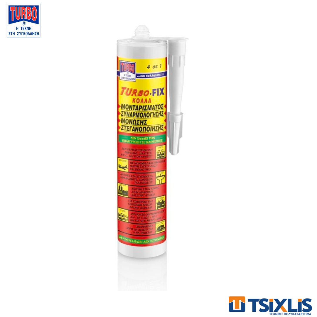 Κατάλληλο για μόνιμα ελαστικές συγκολλήσεις σε βιομηχανικές εφαρμογές, βιομηχανίες σιδήρου, χάλυβα, μετάλλων, αλουμινίου, ξύλου, αυτοκινητοβιομηχανία, ηλεκτρολογικές εγκαταστάσεις, laminate, σοβατεπί, φελλού, πλαστικών, σκυροδέματος, πέτρας, γύψου, κεραμικών, καθρεπτών, θερμομονωτικές και ηχομονωτικές πλάκες, επενδύσεις τοίχων, πάνελ, μάρμαρα, μονωτικά υλικά, πολυστερίνες, πλακάκια, φυσικές πέτρες, παράθυρα, περβάζια, είδη υγιεινής, αξεσουάρ μπάνιου, μηχανές εξαερισμού και κλιματισμού, βαγονιών, κοντέινερ κ.άλ. Βάφεται μετά από την σκλήρυνσή του. Το TURBO – FIX πληροί τις προδιαγραφές του προτύπου DIN EN ISO 846 και συνεπώς είναι κατάλληλο για την εφαρμογή σε εγκαταστάσεις εξαερισμού σύμφωνα με VDI 6022. Επίσης, είναι κατάλληλο και εγκεκριμένο με πιστοποιητικό ISEGA για εφαρμογές σε χώρους φύλαξης τροφίμων.