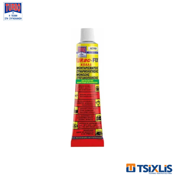 Η TURBO-FIX κόλλα μονταρίσματος και συναρμολόγησης είναι υλικό κόλλησης και στεγανοποίησης, υψηλής ποιότητας, ενός συστατικού, φιλικό στο περιβάλλον. Με ελαστικότητα και δυνατότητα να βάφεται. Eίναι κατασκευασμένη με βάση το πρεπολυμέριο. Χρησιμοποιείται σε ελαστικές κολλήσεις, σφραγίσματα και στεγανοποιήσεις, σε λείες και ανώμαλες επιφάνειες, σε κατασκευές αλουμινίου και μεταλλικές, αίθρια και στέγαστρα, πολυκαρβονικές κατασκευές στη χαλυβουργία, σε κλιματισμού και ψυκτικές κατασκευές, στην κατασκευή οχημάτων, βαγονιών και κοντέϊνερ, όπως επίσης και στις επισκευές τους, στις ναυτιλιακές κατασκευές, στα ναυπηγεία, στις ηλεκτρολογικές, υδραυλικές εγκαταστάσεις και είδη υγιεινής, στις ξυλουργικές εργασίες, καθώς και σε όλες τις κατασκευές