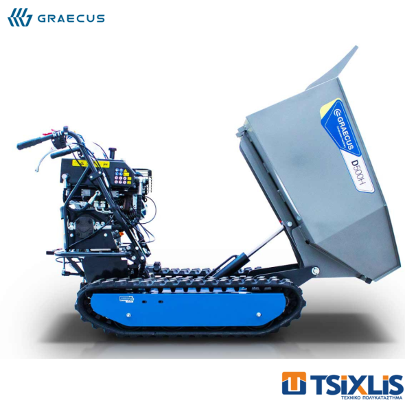 Μεταφορικό καρότσι AGRIMAC 500kg D500H με υδραυλική ανατροπή & κινητήρα Loncin 9hp. Γρήγορη και ομαλή υδραυλική ανατροπή του κάδου με την κίνηση ενός μοχλού. Ο ορθογώνιος σχεδιασμός κάδου και το επίπεδο σχήμα στη πλευρά εξαγωγής είναι για εκφόρτωση ογκωδών υλικών. Ανθεκτικό και αξιόπιστο κιβώτιο ταχυτήτων 3 εμπρός + 1 όπισθεν. Με 4-χρονο κινητήρα βενζίνης και εκκίνηση με χειρόμιζα. Οι ερπύστριες επιτρέπουν τη χρήση του σε έως και 30% κλίση με ικανότητα φόρτωσης και μεταφοράς έως 500kg. Η επιφάνεια φόρτωσης βρίσκεται στο κατάλληλο ύψος ώστε να διευκολύνει τις εργασίες φόρτωσης και εκφόρτωσης. Χαμηλό κέντρο βάρους και σωστή κατανομή του φορτίου εξασφαλίζουν την μέγιστη δυνατή σταθερότητα σε κάθε μορφολογία εδάφους. Ανεξάρτητες μανέτες σύμπλεξης και αποσύμπλεξης σε κάθε τροχό που συμβάλλουν στην εύκολη αλλαγή πορείας και στην επιτόπια περιστροφή. Μετάδοση κίνησης με ιμάντες Kevlar. Ερπύστριες με αυτόματο τεντωτήρα κατασκευασμένες από ειδικό ενισχυμένο καουτσούκ που εγγυώνται τέλεια πρόσφυση και σταθερότητα σε όλους τους τύπους εδάφους χάρη στο πλάτος και το πέλμα τους. Πλήρως εργονομικά χειριστήρια, εύκολα στη χρήση, εγγυώνται εξαιρετική ευελιξία και ακριβή έλεγχο. Μεταλλικό προστατευτικό 5χιλ στο κάτω μέρος για την προστασία του κινητήρα και του κιβωτίου μετάδοσης. Στιβαρή κατασκευή σασιού που περιορίζει τους κραδασμούς και τους θορύβους. Πλήρως κατασκευασμένο από μέταλλα υψηλής αντοχής με κοιλοδοκούς ενίσχυσης στο κάτω μέρος που το καθιστούν κατάλληλο για οποιοδήποτε φορτίο ή πίεση. Η θέση του κινητήρα και του κιβωτίου ταχυτήτων διευκολύνουν τον καθαρισμό και τη συντήρηση τους. Χειρισμός με σύστημα ασφαλείας και αυτόματο χειρόφρενο προσφέρουν τη μέγιστη ασφάλεια. Ευρωπαϊκό πιστοποιητικό ασφαλείας CE.