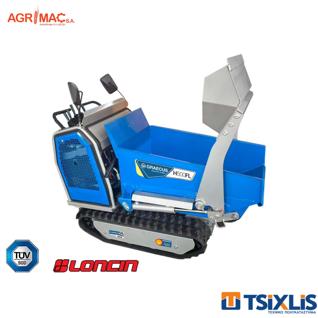Μεταφορικό καρότσι Dumper 500kg Agrimac Graecus H500FL με μπρόσθιο φορτωτή με κουβά διαστάσεων 350 x 660 x 200. Βασικό χαρακτηριστικό του μηχανήματος είναι ο υδροστατικός κινητήρας. Αυτό προσφέρει σημαντικά πλεονεκτήματα, όπως η συνεχής ρύθμιση της ταχύτητας, η γραμμική κίνηση του κιβωτίου ταχυτήτων, υψηλή ροπή και προστασία από υπερφόρτωση. Αναδιπλούμενο σκαλοπάτι για τη μεταφορά του χειριστή κατά τις εργασίες. Γρήγορη και ομαλή υδραυλική ανατροπή του κάδου με την κίνηση ενός μοχλού. Ορθογώνιος σχεδιασμός κάδου και επίπεδο σχήμα στη πλευρά εξαγωγής για εκφόρτωση ογκόδων υλικών. Υδροστατικό κιβώτιο ταχυτήτων 2 εμπρός + 2 όπισθεν που ελαχιστοποιεί τις τριβές προσφέροντας μεγαλύτερη αντοχή και διάρκεια ζωής. 4-χρονος κινητήρας βενζίνης, εκκίνηση με χειρόμιζα. Οι ερπύστριες επιτρέπουν τη χρήση του σε έως και 30% κλίση με ικανότητα φόρτωσης και μεταφοράς έως 500kg. Η επιφάνεια φόρτωσης βρίσκεται στο κατάλληλο ύψος διευκολύνοντας τις εργασίες φόρτωσης και εκφόρτωσης. Χαμηλό κέντρο βάρους και σωστή κατανομή του φορτίου εξασφαλίζουν την μέγιστη δυνατή σταθερότητα σε κάθε μορφολογία εδάφους. Ερπύστριες με αυτόματο τεντωτήρα κατασκευασμένες από ειδικό ενισχυμένο καουτσούκ που εγγυώνται τέλεια πρόσφυση και σταθερότητα σε όλους τους τύπους εδάφους χάρη στο πλάτος και το πέλμα τους. Πλήρως εργονομικά χειριστήρια, εύκολα στη χρήση, εγγυώνται εξαιρετική ευελιξία και ακριβή έλεγχο. Μεταλλικό προστατευτικό 5χιλ στο κάτω μέρος για την προστασία του κινητήρα και του κιβωτίου μετάδοσης. Στιβαρή κατασκευή σασιού που περιορίζει τους κραδασμούς και τους θορύβους. Πλήρως κατασκευασμένο από μέταλλα υψηλής αντοχής με κοιλοδοκούς ενίσχυσης στο κάτω μέρος που το καθιστούν κατάλληλο για οποιοδήποτε φορτίο ή πίεση. Η θέση του κινητήρα και του κιβωτίου ταχυτήτων διευκολύνουν τον καθαρισμό και τη συντήρηση τους. Χειρισμός με σύστημα ασφαλείας και αυτόματο χειρόφρενο προσφέρουν τη μέγιστη ασφάλεια. Πιστοποιητικό ασφαλείας CE.