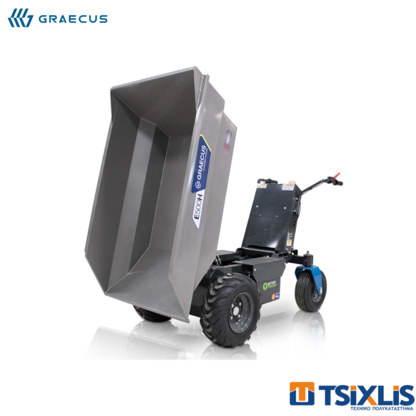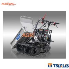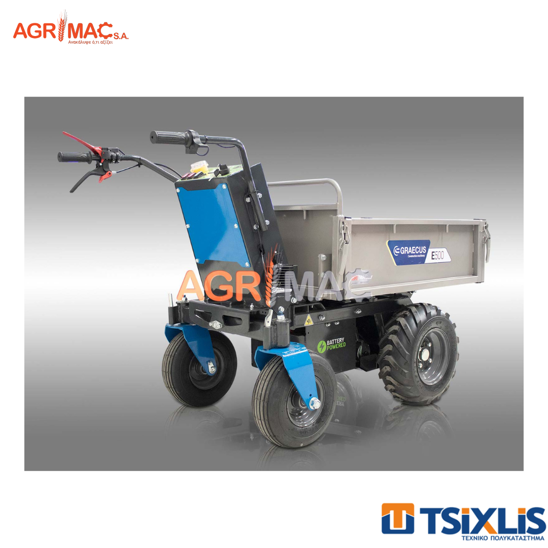 Μεταφορικό καρότσι, dumper Agrimac με ηλεκτρικό κινητήρα 1000W/48V αρκετά ισχυρός για μεταφορά φορτίου 500kg έως 10% κλίση ,τελείως αθόρυβα. Ζυγαριά στους πίσω τροχούς για εύκολη αναρρίχηση σε ανώμαλα εδάφη. Η επιφάνεια φόρτωσης βρίσκεται στο κατάλληλο ύψος ώστε να διευκολύνει τις εργασίες φόρτωσης και εκφόρτωσης. Χαμηλό κέντρο βάρους και σωστή κατανομή του φορτίου εξασφαλίζουν την μέγιστη δυνατή σταθερότητα σε κάθε μορφολογία εδάφους. Πλήρως εργονομικά χειριστήρια, εύκολα στη χρήση, εγγυώνται εξαιρετική ευελιξία και ακριβή έλεγχο κατά τη διάρκεια της εργασίας. Στιβαρή κατασκευή σασιού που περιορίζει τους κραδασμούς και τους θορύβους. Πλήρως κατασκευασμένο από μέταλλα υψηλής αντοχής με κοιλοδοκούς ενίσχυσης στο κάτω μέρος που το καθιστούν κατάλληλο για οποιοδήποτε φορτίο ή πίεση. Επιλογή 3 ταχυτήτων πορείας 2.1, 2.6, 3.3 km/h.