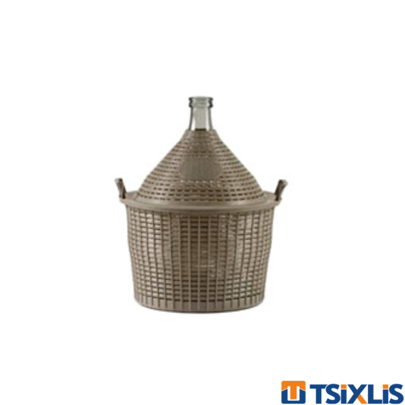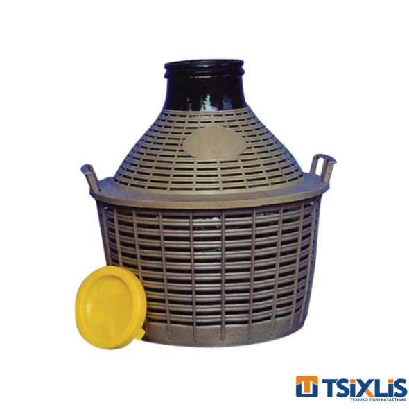 Νταμιτζάνα γυάλινη μεσαίου μεγέθους - 34Lt. Διακομισμένη με δίχτυ πλαστικό. Συμπεριλαμβάνεται τάπα πλαστική.