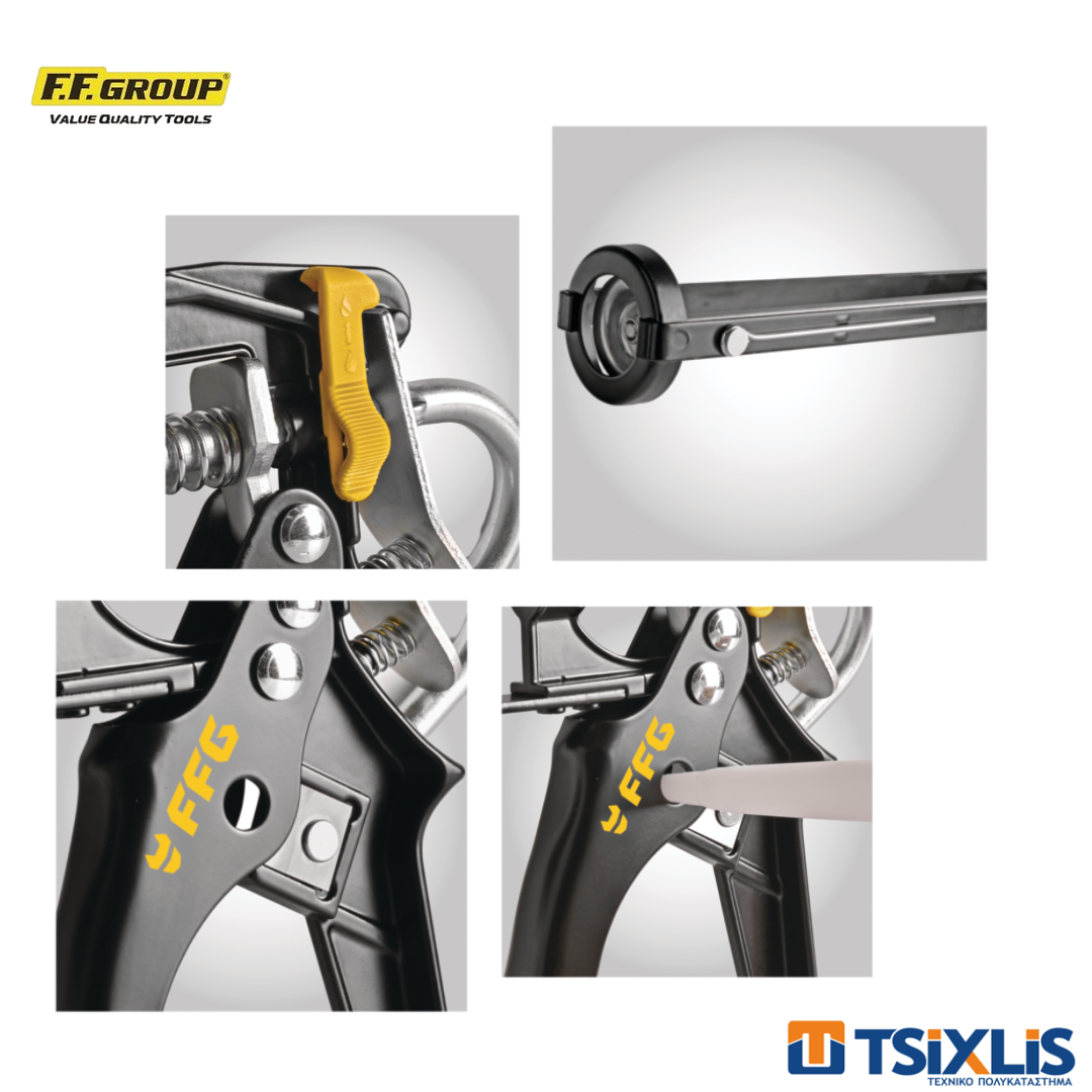 Ιδανικό για σιλικόνες, κατασκευαστικές κόλλες, ελαστομερή, πολυουρεθάνες. Λαβή και σκανδάλη αλουμινίου. Επιλογή λειτουργίας: dripless ή μη. Καρφί διάτρησης και κόφτης ακροφυσίου. Γάντζος σκάλας.