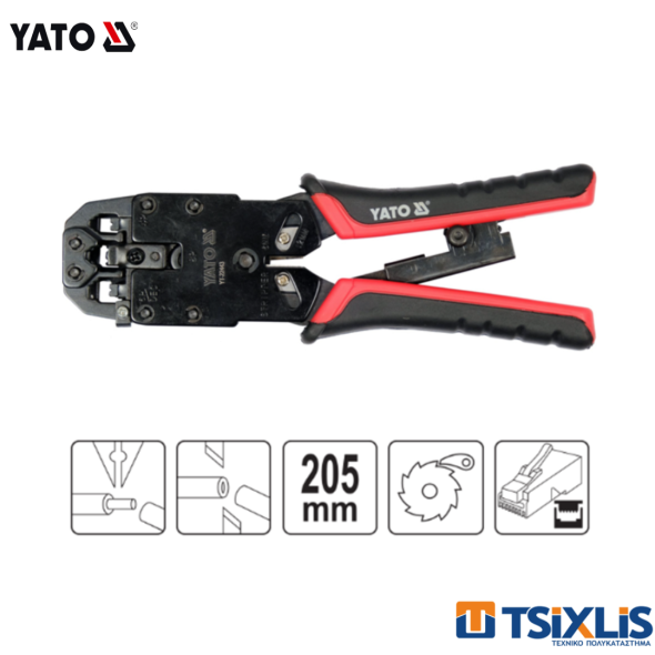 Πένσα YT-22443 με μηχανισμό καστάνιας για πρεσάρισμα ακροδεκτών τηλεφώνου και δικτύου. Kατασκευασμένη από ανθρακούχο χάλυβα με προστασία από τη διάβρωση. Με πλαστικά καλύμματα λαβής δύο συστατικών. Το σκληρότερο συστατικό PP προσκολλάται σταθερά στο σώμα, ενώ το εξωτερικό τμήμα TPR είναι ευχάριστο στην αφή και έχει αντιολισθητικές ιδιότητες. Είναι δυνατή η πτύχωση των άκρων τηλεφώνου RJ10, RJ11, RJ12 δυνατότητα πρεσαρίσματος ακροδεκτών δικτύου RJ45 γρήγορη απογύμνωση καλωδίων διαμέτρου CAT.5 δυνατότητα κοπής του καλωδίου.