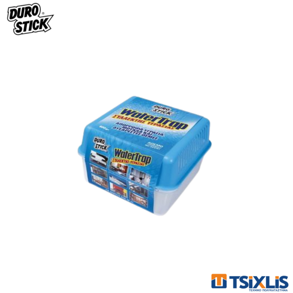Ο συλλέκτης υγρασίας DUROSTICK WATERTRAP απορροφά την υγρασία της ατμόσφαιρας, με τη βοήθεια ειδικών κρυστάλλων. Η μείωση της πλεονάζουσας υγρασίας έως και 40% απαλλάσσει κάθε κλειστό χώρο από δυσάρεστες οσμές, ενώ ταυτόχρονα δεν ευνοεί την ανάπτυξη μούχλας, βακτηρίων και μικροοργανισμών. Η τοποθέτησή του σε κατοικήσιμους χώρους, βελτιώνει την ποιότητα του αέρα, προλαμβάνοντας αλλεργίες, κεφαλαλγίες και ρευματικούς πόνους. Έχει εξαιρετικά αποτελέσματα σε κλειστούς ή όχι τακτικά αεριζόμενους χώρους, όπως αποθήκες, υπόγεια, γκαράζ, πατάρια, σοφίτες, θερμαινόμενες εσωτερικές πισίνες, εξοχικά σπίτια, τροχόσπιτα, σκάφη αναψυχής, ντουλάπια κουζίνας και ντουλάπες. ‘Αποτρέπει’ βλάβες σε ηλεκτρικές συσκευές όπως τηλεοράσεις, Η/Υ, Hi-Fi κλπ. Διατηρεί ανέπαφα, ευαίσθητα στην υγρασία χάλκινα και ορειχάλκινα αντικείμενα, καθώς και βιβλία, έγγραφα κλπ.